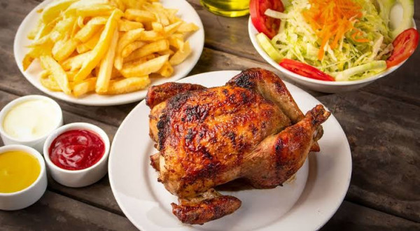 Un pollo a la brasa con su inca cola.